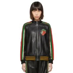 Gucci Black Leather Strawberry Patch Track Jacket