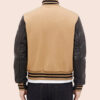 The wool-blend fabric was used in the creation of this impeccable Black and Brown Golden Bear Bomber Varsity Jacket for Men. This jacket’s leather sleeves are a one-of-a-kind finishing touch. It has rib-knitted cuffs, a brown and black rib-knitted collar, and a front button closure. In addition, the inner side is lined with a silky viscose to provide the wearer with comfort.