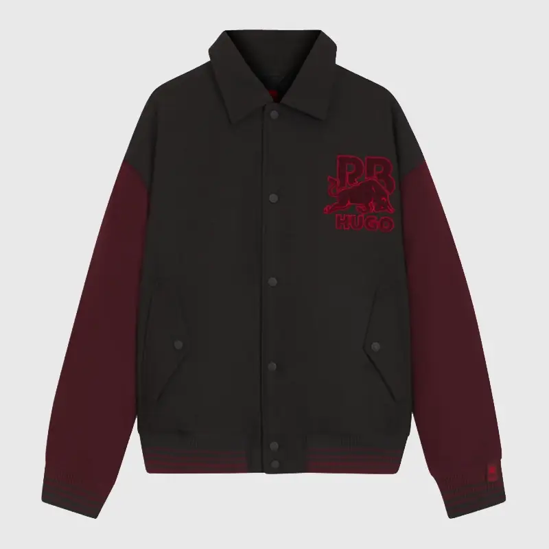 Crafted by The Shearling Jacket, this varsity jacket showcases the brand’s renowned craftsmanship. Details like embroidered patches, contrasting sleeves, and snap-button closure highlight its varsity roots, while the RB and HUGO branding add a contemporary edge. Its tailored fit ensures comfort without compromising style. The jacket is an iconic representation of motorsport energy and high-end streetwear appeal