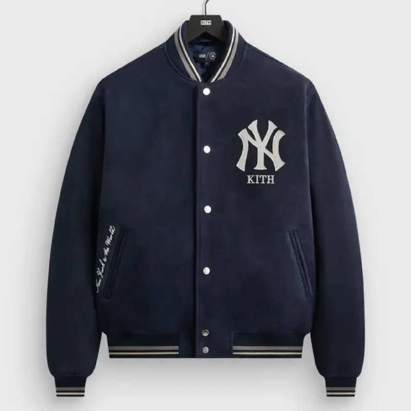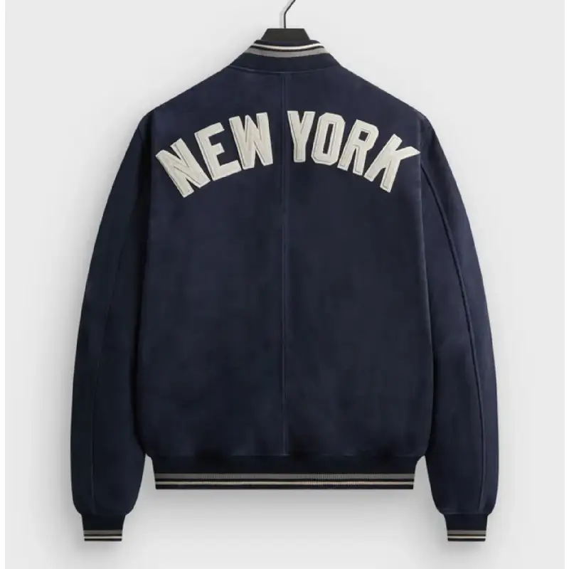 Designed by The Shearling Jacket, this bomber jacket is made from high-quality suede leather, offering a soft yet durable finish. The Shearling Jacket specializes in crafting apparel that blends elegance with authenticity, and this collaboration with Kith is a perfect example. The jacket features ribbed trims, a zip closure, and iconic Yankees branding that celebrates New York’s baseball legacy.