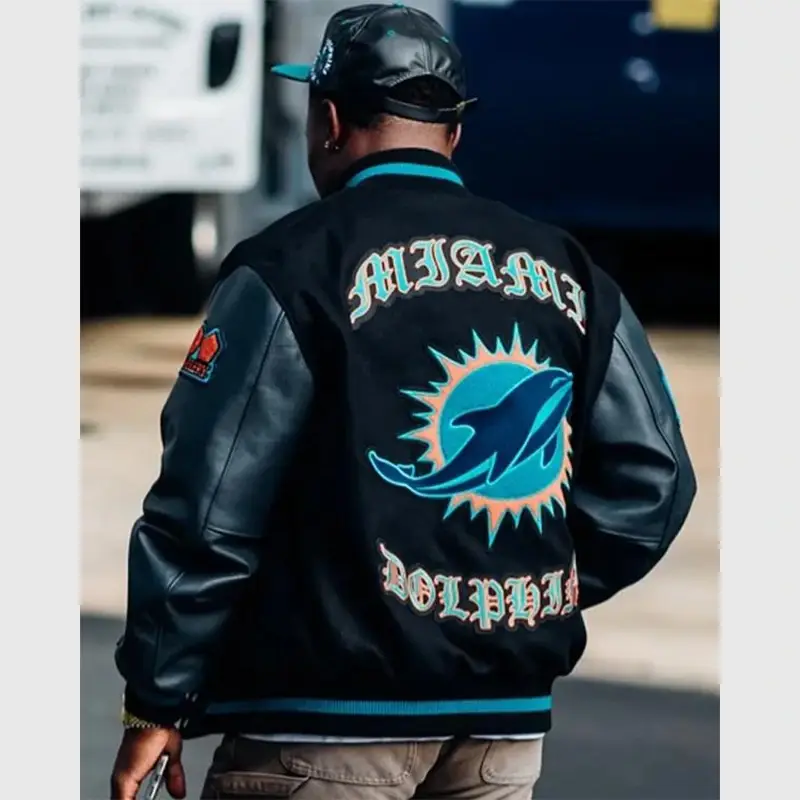 Crafted from premium wool with genuine leather sleeves, The Shearling Jacket ensures both warmth and durability. The wool body provides insulation for cooler days, while the smooth leather sleeves add an edgy contrast and long-lasting strength. Rib-knit trims around the collar, cuffs, and hem enhance comfort and fit, and the snap-button front closure keeps the traditional varsity charm intact. With detailed Dolphins embroidery and team patches, every stitch celebrates loyalty and performance.