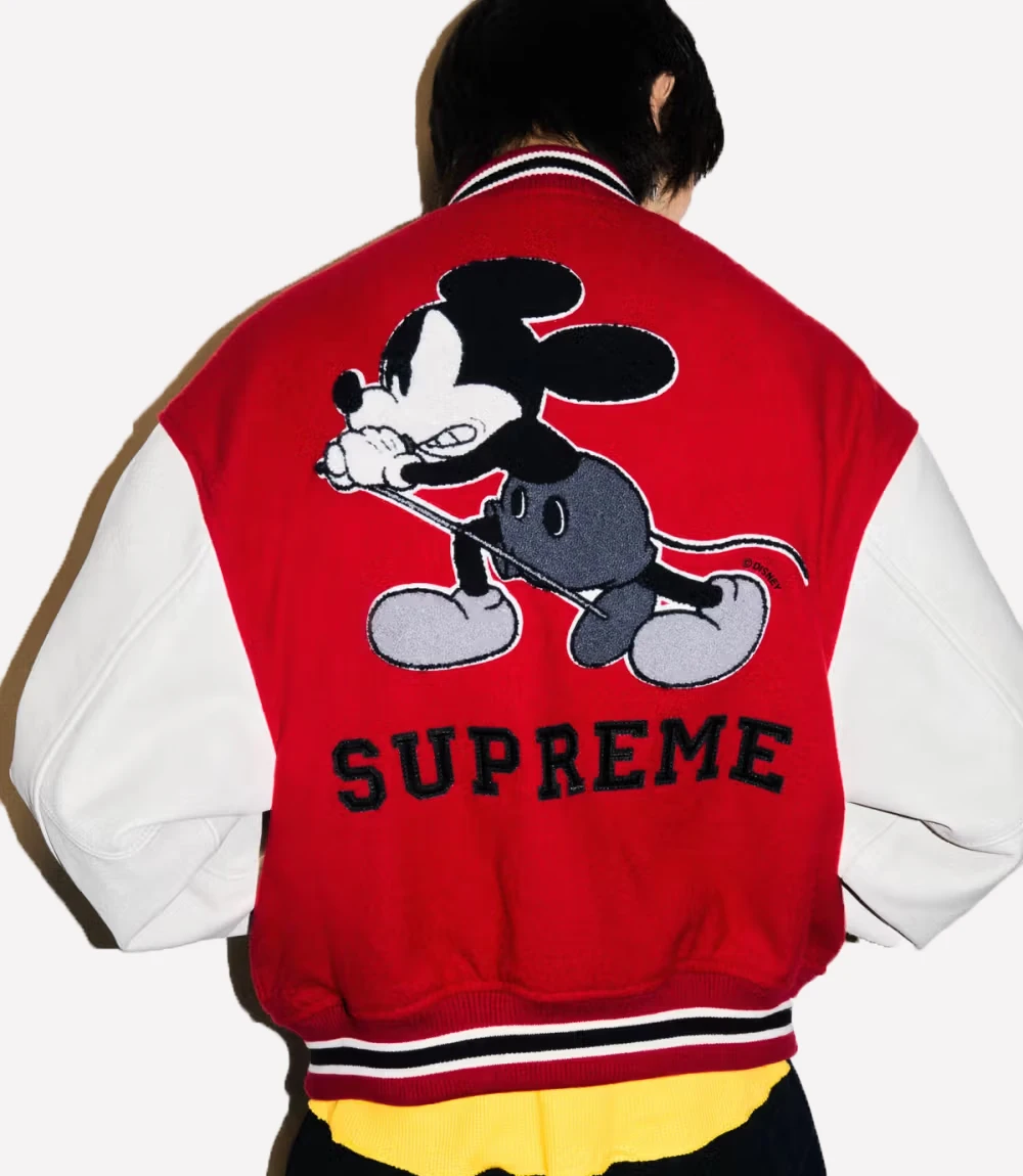 Bring a playful twist to streetwear luxury with the Supreme Mickey Mouse Red Varsity Jacket. This statement piece blends the nostalgia of Disney with the bold aesthetic of Supreme, creating a jacket that resonates with both fashion enthusiasts and pop culture lovers. Its vibrant red color, detailed embroidery of Mickey Mouse, and classic varsity silhouette make it a standout in any wardrobe.