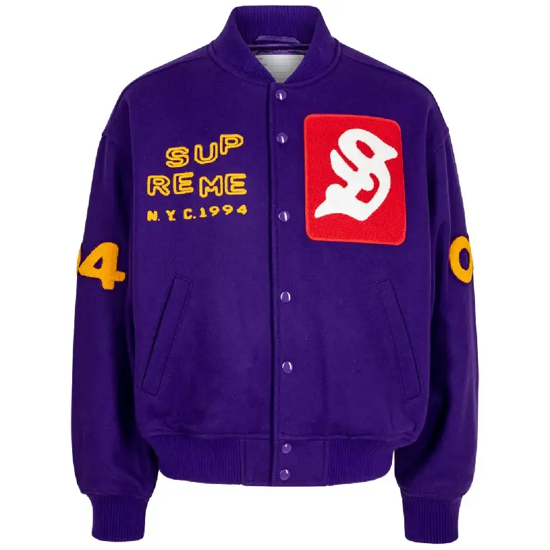 Crafted with care by The Shearling Jacket, this varsity jacket is made from high-quality wool fabric, offering unmatched warmth and durability. The ribbed cuffs, button-down closure, and embroidered Supreme logos emphasize authenticity and craftsmanship. The soft interior lining ensures comfort, while the vibrant purple hue and varsity design elevate any outfit. For fashion enthusiasts and collectors alike, the jacket represents creativity and individuality. It’s a timeless piece that celebrates bold fashion and streetwear prestige.